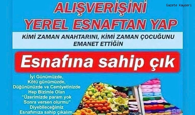 Ramazan ayı öncesinde vatandaşlara seslenen Kayseri Esnaf ve Sanatkârlar Derneği Başkanı Kemal Erçalık, ramazan alışverişleri konusunda vatandaşların esnafları tercih etmesini istedi. Özellikle büyük market zirleri yerine mahalle ve semt esnaflarından alışveriş yapılmasının da gerektiğini savunan Başkan Erçalık, “Önümüz Ramazan ayı ve ramazan hazırlıkları başladı. Vatandaşlarımızdan mahalle ve semt esnaflarından da alışveriş yapmalarını, küçük esnafımıza destek olmalarını bekliyoruz. İyi günümüzde, kötü günümüzde, düğünümüzde ve cenazemizde hep bizimle olan ‘Üzerimde para yok, sonra bıraksam olur mu?’ diyebileceğimiz esnafımıza sahip çıkalım” açıklamasında bulundu. (Haber Merkezi)