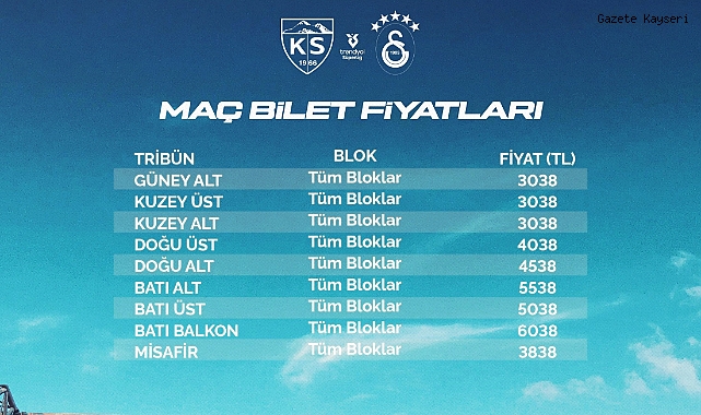 Kayserispor Kulübünden yapılan açıklamada; "Haydi Kayseri Şehrin Kalbi'nde buluşuyoruz. Kayserisporumuzun Süper Lig 2025-2026 Sezonu 3. haftasında 24 Ağustos Pazar günü saat 21.30'da Galatasaray ile oynayacağı karşılaşmanın biletleri Passo tarafından satışa sunulmuştur" ifadelerine yer verildi. Kayserispor-Galatasaray maçın tribün bilet fiyatları ise şu şekilde;