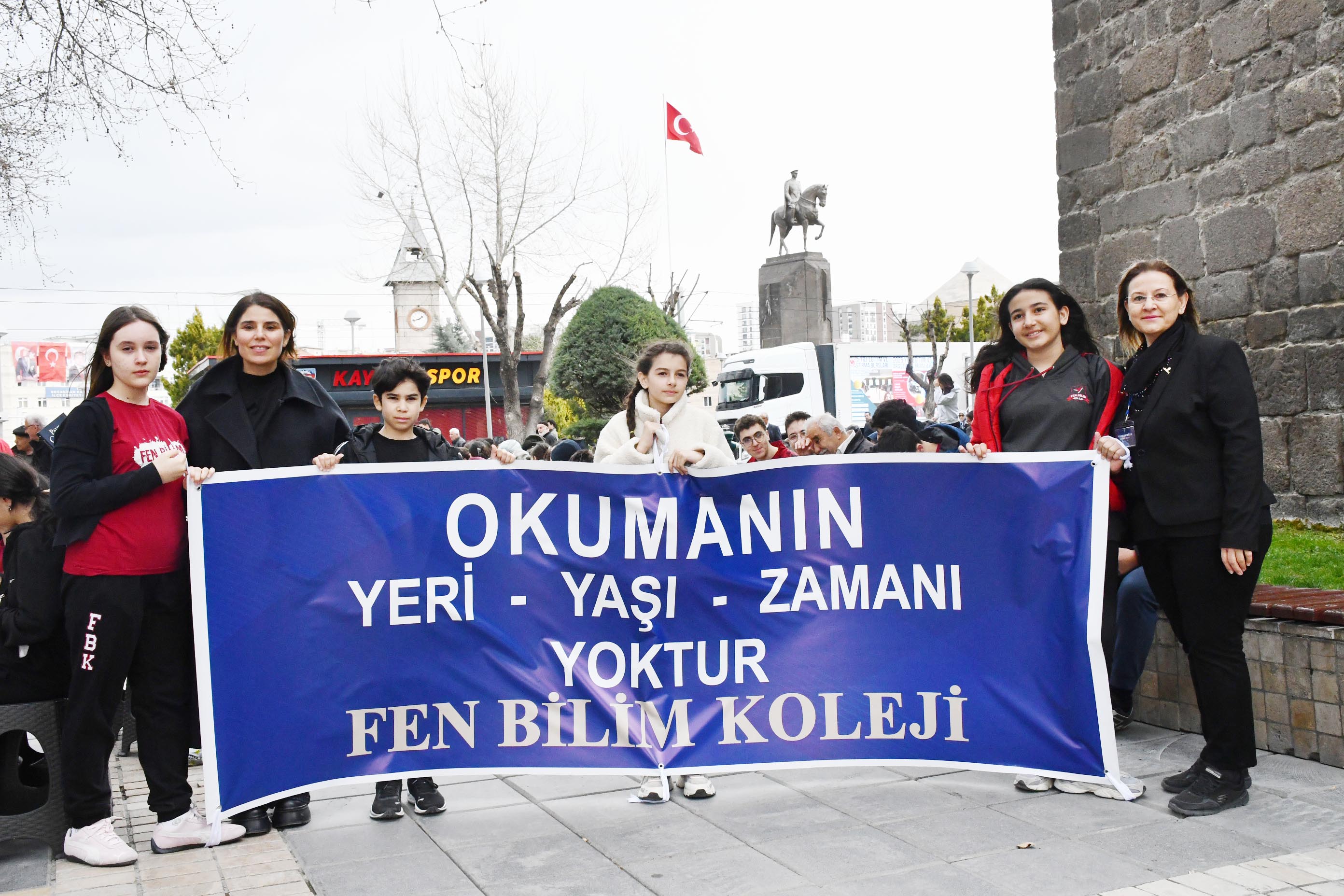 Kayseri Cumhuriyet Meydan’ında düzenlenen ‘kitap okuma ve sessiz bir farkındalık hareketi’ ile bir araya gelen öğrenciler yanlarında getirdikleri çeşitli kitapları bir ders saati kitap okuma etkinliği yapıldı. Kitap okuyan öğrencilere, öğretmenleri ve vatandaşlar eşlik etti. Kayseri Fen Bilim Koleji “Kitap Okuyor" adıyla düzenlenen etkinlikte öğrenciler kitap sayesinde yenidünyalar keşfe çıktıklarını söylerken öğretmenler ise buna vesile olmanın kendileri için gurur verici bir sorumluluk olduğuna belirttiler. Kayseri Fen Bilim Kolej öğretmenleri ve öğrencileri kitap okuma sessiz bir farkındalık etkinliği ile okumanın sadece dört duvar arasında olmadığını bir kere daha gösterdiler.