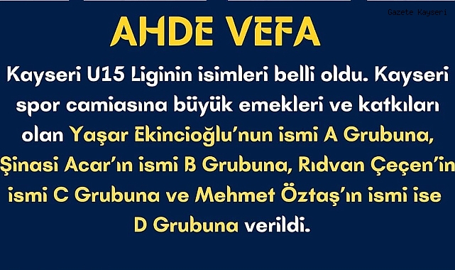 Kayseri Amatör Spor Kulüpleri Federasyonu'ndan (ASKF) geçtiğimiz hafta başlayan U15 Ligine ahde vefa örneği sergileyerek, spor camiasına emeği olan kişilerin isimlerini gruplara verdi.