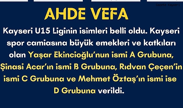 Kayseri Amatör Spor Kulüpleri Federasyonu yapılan paylaşımda; "Kayseri U15 Ligi isimleri belli oldu. Kayseri spor camiasına büyük emekleri ve katkıları olan kişilerin isimlerini yaşarken onore ediyoruz. Geçtiğimiz hafta başlayan U15 Ligi A Grubuna Yaşar Ekincioğlu’nun ismi B Grubuna Şinasi Acar’ın ismi, C Grubuna Rıdvan Çeçen’in ismi ve D Grubuna Mehmet Öztaş’ın verildi" denildi.