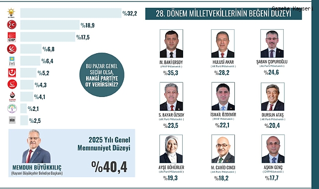 AK Parti Kayseri Milletvekili Şaban Çopuroğlu yüzde 24,6, AK Parti Kayseri Milletvekili Sayın Bayar Özsoy yüzde 23,5, MHP Genel Başkan Yardımcısı ve Kayseri Milletvekili İsmail Özdemir yüzde 22,1, AK Parti Kayseri Milletvekili Dursun Ataş yüzde 20,4, AK Parti Kayseri Milletvekili Ayşe Böhürler yüzde 19,3, AK Parti Kayseri Milletvekili Murat Cahid Cıngı yüzde 18,2, CHP Kayseri Milletvekili Aşkın Genç yüzde 17,7.