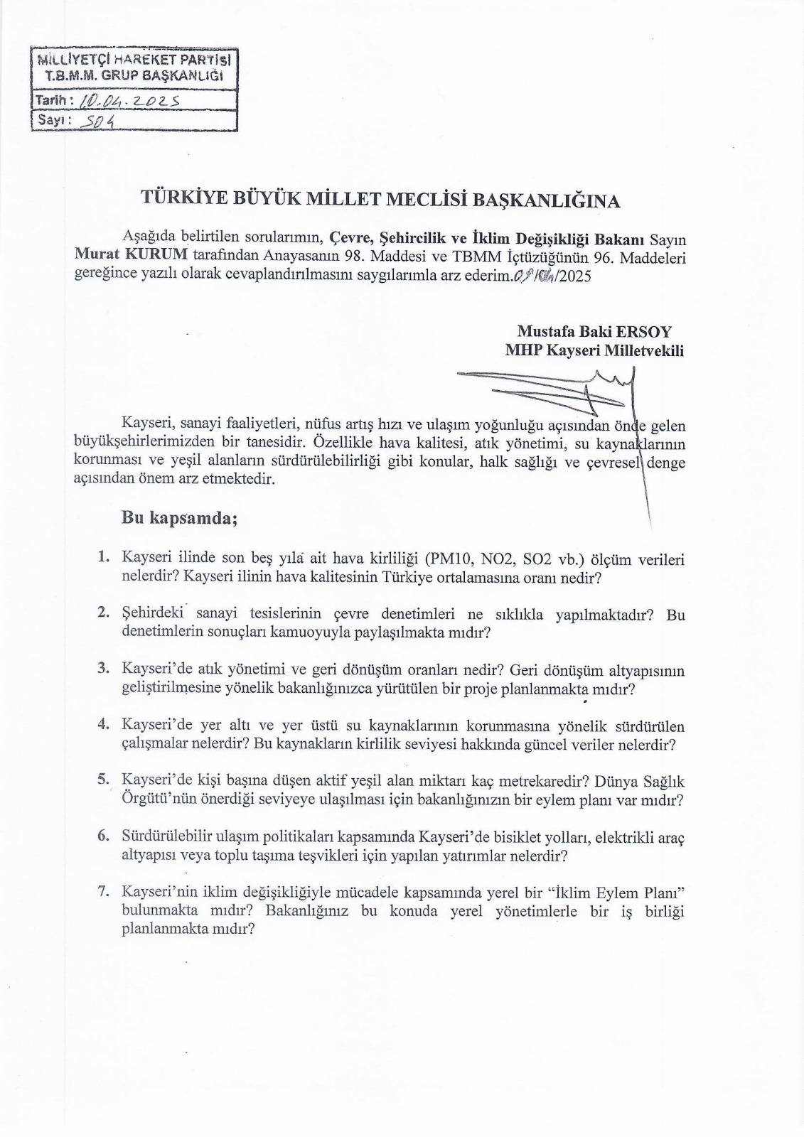 Milliyetçi Hareket Partisi (MHP) Kayseri Milletvekili Mustafa Baki Ersoy, Kayseri’nin çevresel sorunlarını Türkiye Büyük Millet Meclisi gündemine taşıdı. Milletvekili Ersoy, Çevre, Şehircilik ve İklim Değişikliği Bakanı Murat Kurum’un yazılı olarak cevaplaması talebiyle 7 maddelik soru önergesi sundu.