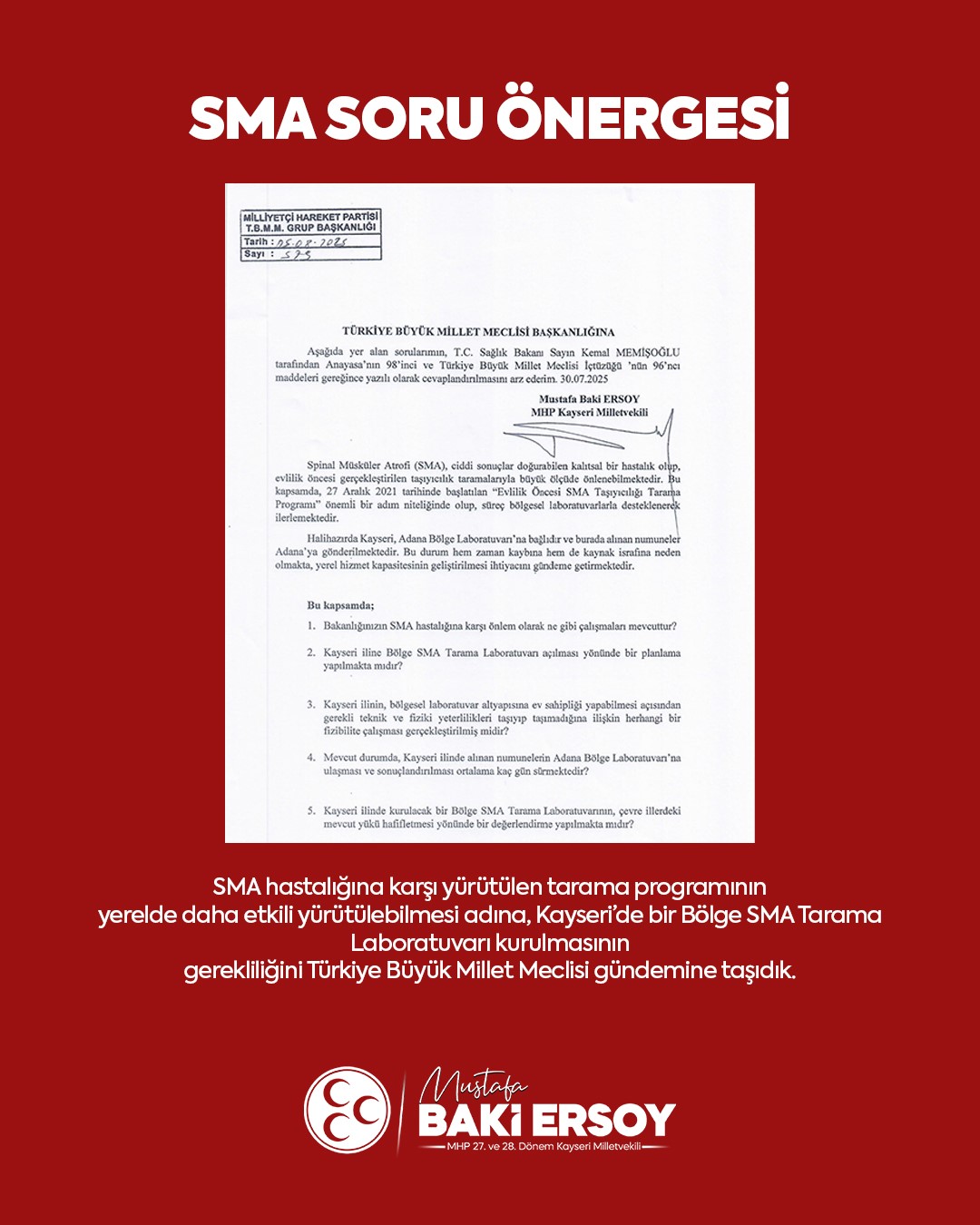 MHP Kayseri Milletvekili Baki Ersoy, Spinal Müsküler Atrofi (SMA) hastalığına karşı yürütülen tarama programlarının yerelde daha etkin yürütülebilmesi amacıyla Kayseri’de bir Bölge SMA Tarama Laboratuvarı kurulmasının gerekliliğini Türkiye Büyük Millet Meclisi gündemine taşıdı.