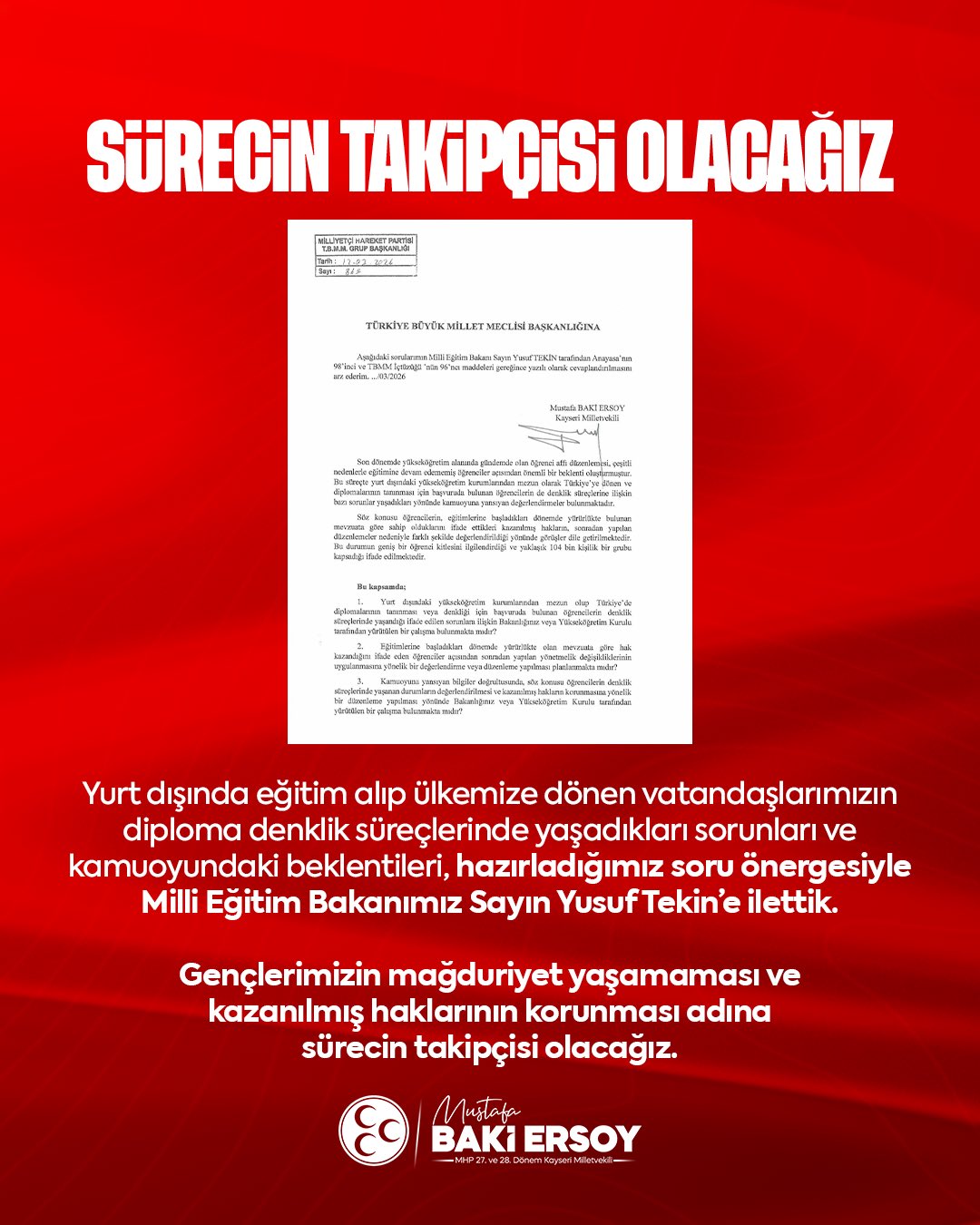 "Yurt dışında eğitim alıp ülkemize dönen vatandaşlarımızın diploma denklik süreçlerinde yaşadıkları sorunları ve kamuoyundaki beklentileri, hazırladığımız soru önergesiyle Milli Eğitim Bakanımız Sayın Yusuf Tekin’e ilettik. Gençlerimizin mağduriyet yaşamaması ve kazanılmış haklarının korunması adına sürecin takipçisi olacağız."
